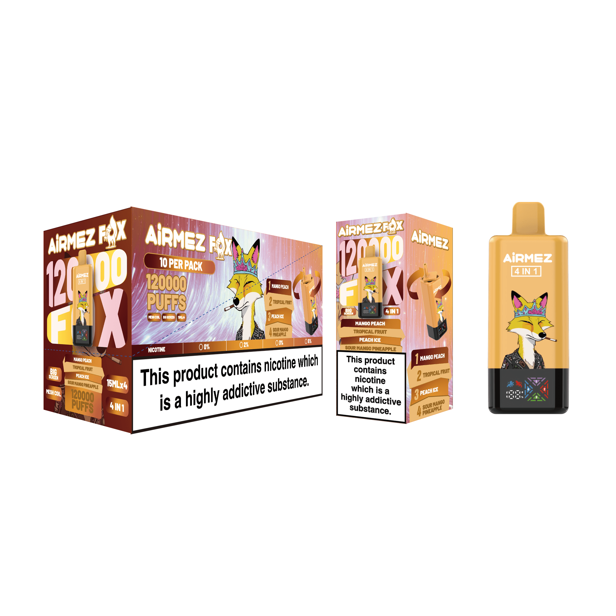 Unleash your vaping into legendary territory with the Airmez Fox 4 in 1 120K Puffs Disposable Vape – a cunning fusion of technology and zest, delivering 120,000 surges of mesmerizing harmony in a package as captivating as it is ferocious.