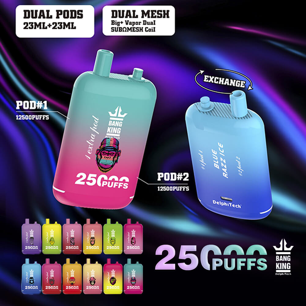 Bang King 25000 Puffs Dual Pods, ki je na voljo pri Randmvaperju, je napredna naprava za enkratno uporabo, ki ponuja 25.000 puffov z dvema 23-mililitrskima podoma, 650 mAh akumulatorsko baterijo in različne vrhunske okuse za vrhunsko izkušnjo vapinga.