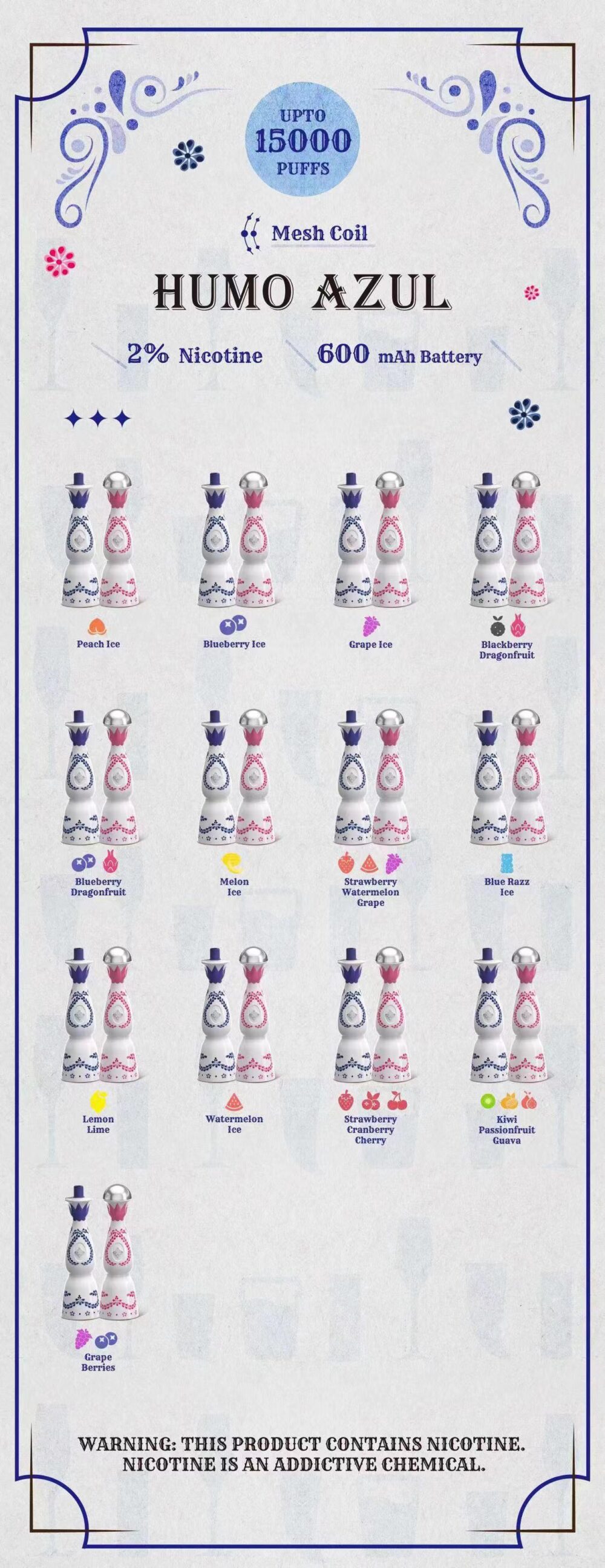 Pisalo za vaping Humo Azul 15000 Puffs, izdelano za zahtevne uporabnike, ki dajejo prednost kakovosti in zanesljivosti, se odlikuje v konkurenčnem okolju vapingov za enkratno uporabo. Njegova elegantna, kompaktna zasnova zagotavlja lahkotno prenašanje, lahka konstrukcija pa zagotavlja optimalno udobje med daljšo uporabo. Ta naprava predstavlja edinstveno priložnost za veletrgovce, ki želijo svojim strankam ponuditi vrhunsko in dolgotrajno rešitev za uparjanje. Vsako pero je zasnovano tako, da omogoča do 15.000 vdihov, zato je ena najbolj vzdržljivih in učinkovitih možnosti na današnjem trgu.