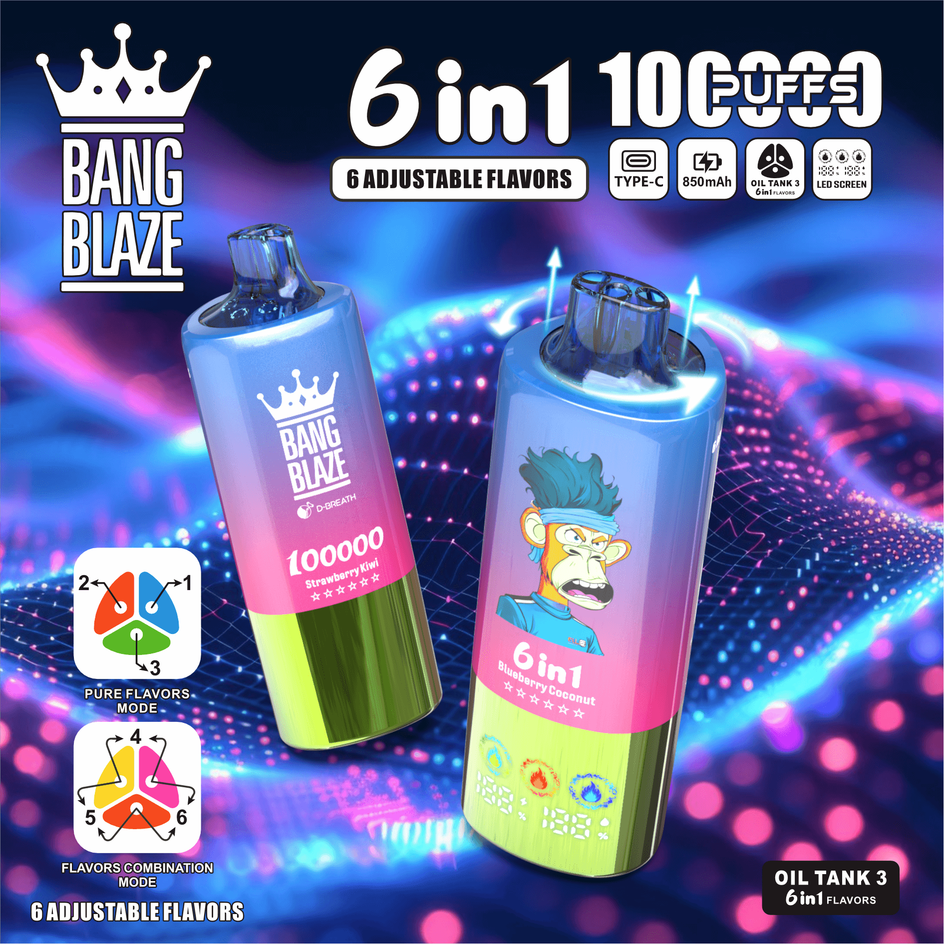 Envision this: a sleek, hell-forged behemoth brimming with 60ml of molten e-liquid across three tanks, adjustable to 0%, 2%, 3%, or 5% nicotine strengths to fuel your fire – from smoldering embers to raging wildfires. At its core roars an 850mAh rechargeable battery, an insatiable furnace that reignites in seconds via Type-C, keeping your fury ablaze without falter. The Bang Blaze 6 in 1 100000 Puffs Disposable Vape wields triple mesh coils that devour every flavor essence, conjuring velvety MTL (Mouth to Lung) vapors so intense, they’ll hurl you into a vortex of eternal tropical tempests.